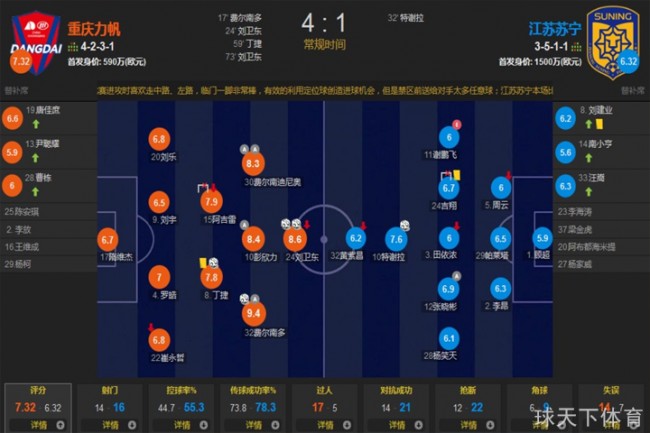 本场比赛,“葡萄牙黄金一代教头”保罗·本托选择了重庆队以前主打的传统阵型4-2-3-1为本场战术安排,在边路的选择上,保罗·本托继续使用速度奇快的“小摩托”费尔南多和费尔南迪尼奥。不得不说,也正是因为这2位速度奇快的边场频繁的冲击着苏宁的防线将苏宁压着打。而重庆队四名后卫的配合更是天衣无缝,在控球率较低于江苏苏宁的情况下,重庆队的队员恰到好处的协防和紧盯对方前场攻击人员的战术发挥奇效,将苏宁的进攻机会扼杀在禁区外。不得不说,依靠着2位速度奇快的边锋,保罗·本托依旧可以凭借着这套阵容打出高质量、高配合的防守反击。要是依照此般,那么重庆斯威也许会成为本赛季中超球队中的另一匹黑马,也许还能因此收获亚冠席位。