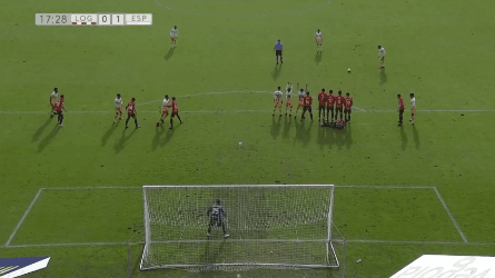 第17分钟,德托马斯建功!西班牙人获得前场的任意球机会,德托马斯主罚直接远射,皮球划出一道美妙弧线,越过人墙后坠入球门右侧死角!1-0!
