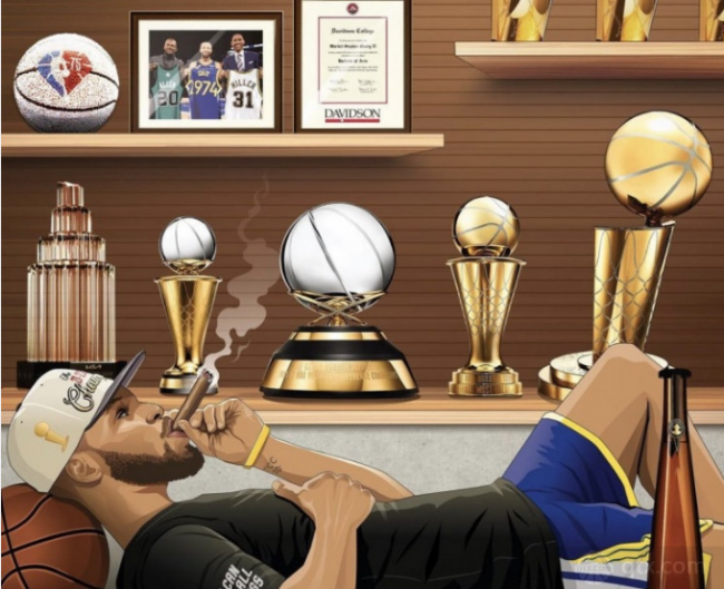 著名画师marvelus.art也在此之前绘制了一张图,在图片中库里枕在篮球上,嘴里叼着雪茄,桌子上还有美味的红酒,而在墙上,则是库里本赛季所取得了所有荣誉。不得不说,库里本赛季如愿达成个人荣誉“大满贯”,是生涯巅峰的一年。