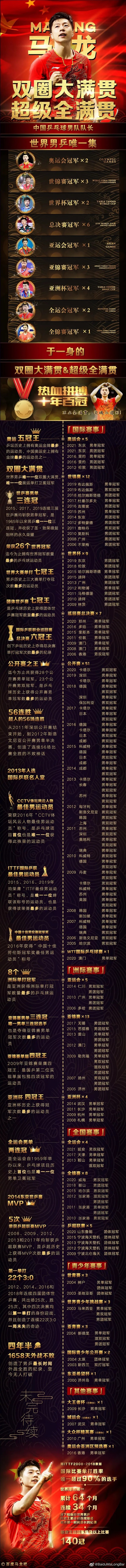 在2008年-2018年,马龙是国际比赛中单打胜率唯一超过90%的选手。虽说马龙目前世界排名屈居第二,但他曾连续34个月、累计64个月稳坐世界排名第一,创下和保持世界男乒历史上累计和连续排名世界第一时间最长的记录。马龙职业生涯国家级及以上比赛截至目前为止共斩获140个冠军,是首位集奥运会、世锦赛、世界杯、亚运会、亚锦赛、亚洲杯、巡回赛总决赛、全运会单打冠军于一身的超级全满贯男子乒乓球运动员。