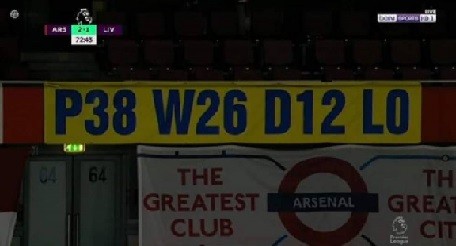 阿森纳在横幅上写道:“你们的奖杯是金杯吗?”、“38场比赛,26胜12平0负”。