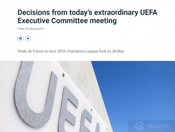 欧足联官方公告中表示,欧足联执行委员会决定将本赛季的欧洲男子足球冠军联赛决赛从原举办地俄罗斯圣彼得堡迁至法国巴黎圣丹尼斯的法兰西体育场。欧足联还对法国总统马克龙对举办欧洲杯决赛所提供的个人支持和承诺表示感激和赞赏,正是因为他的帮助让欧洲足球俱乐部比赛中最受关注的比赛在一个突如其来的危机时期迁至法国举办。而且接下来的俄罗斯和乌克兰的一系列国际足球赛事都将移至中立的国家场地进行,换言之,俄罗斯和乌克兰就变相失去了主场优势!