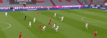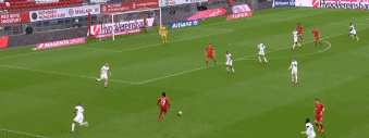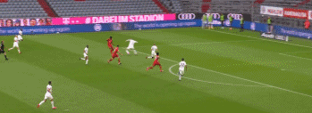 第46分钟,穆勒挑传,科曼带球突入禁区,底线传中,莱万中路头槌破门,拜仁3-0法兰克福!
