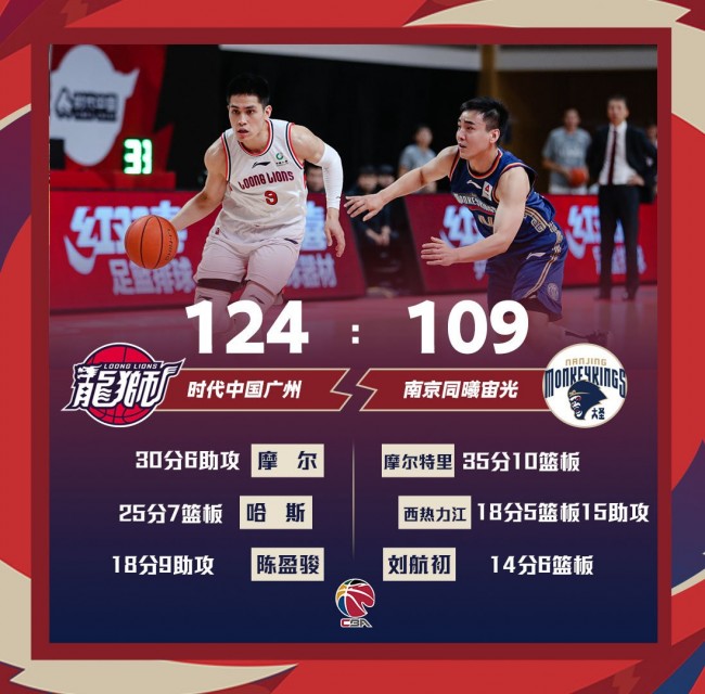 末节开打,王子麒左侧三分稳稳命中,肖恩-希尔杀入内线打成2+1。广州这边陈盈骏节奏变换上篮得分,祝铭震底角三分应声入网。同曦则是依靠王旭突破分球,焦恩格尔抛投得手,摩尔特里强攻篮下打成2+1。随后广州稳扎稳打,同曦无力回天。最终,广州以124-109轻取同曦。