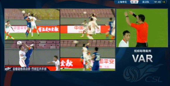 补时第2分钟,var介入比赛,主裁去到场边看过回放后判罚李超手球!点球!