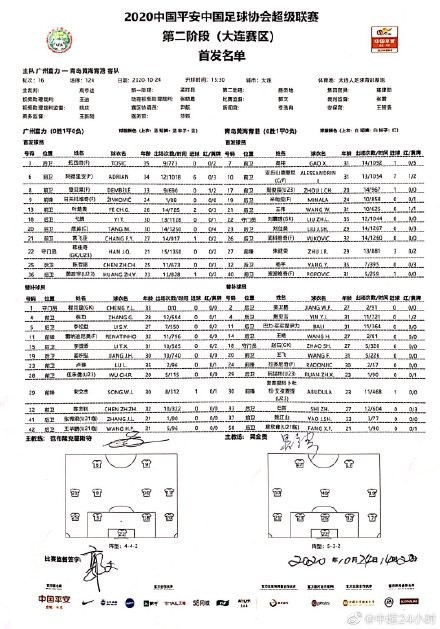 中超保级战-广州富力vs青岛黄海首发:442vs532