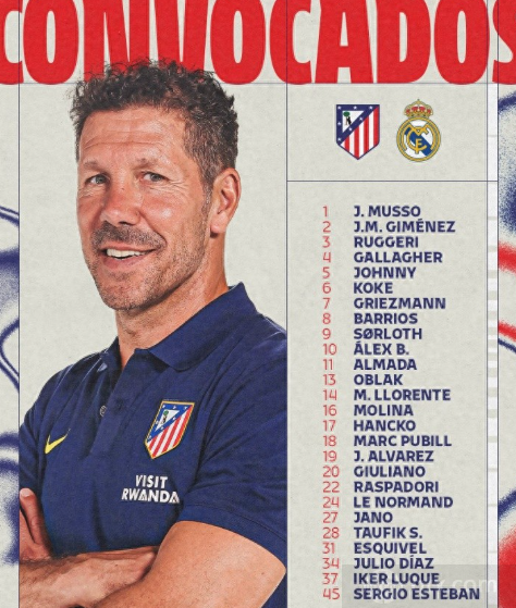在马德里竞技公布的名单中,球队基本全主力入选。在门将位置上,球队核心奥布拉克在列,这名老将目前依旧保持着出色的比赛状态,在本赛季也是多次做出关键扑救,在西超杯的比赛中奥布拉克也将继续成为球队信任的选择。在后卫线上,球队主力汉茨科、勒诺尔芒、略伦特等球员在列,球队也能够排出稳定的首发后防阵容迎战具备出色进攻能力的对手。在中场位置上,球队老将科克坐镇,这名球队队长依旧是马德里竞技不可或缺的一员,是球队的攻防核心之一,在本次西超杯也将继续发挥自己的领导作用。另外巴埃纳、巴里奥斯以及加拉格尔等球员也有入选。在最关键的锋线位置上,球队几名主力前锋都在列,包括阿尔瓦雷斯、格列兹曼以及瑟洛特。这几名前锋都在本赛季参与了球队的很多进球,其中阿尔瓦雷斯作为球队的头号得分手,也是球队的进攻核心,在半决赛面对皇家马德里球员也将争取再次取得进球。而格里兹曼作为拥有丰富经验的老将,能够给球队的进攻带来变化,可以作为球队的首发也可以作为球队替补待命。另外,球队中锋瑟洛特也可以给马德里竞技带来其他的战术选择。可以说,马德里竞技的锋线具备很强实力,这也将成为马竞与其他几支队伍争夺西超杯冠军的关键。