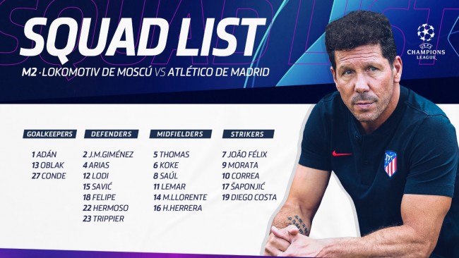 北京时间10月2日凌晨03:00,马竞将在欧冠小组赛第二场比赛中客场对阵莫斯科火车头,目前球队公布了本场比赛的大名单。