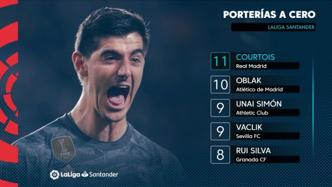 在皇马1-0战胜马竞后,库尔图瓦收获了自己在西甲的第11场零封,目前他的零封场次位列西甲第一。