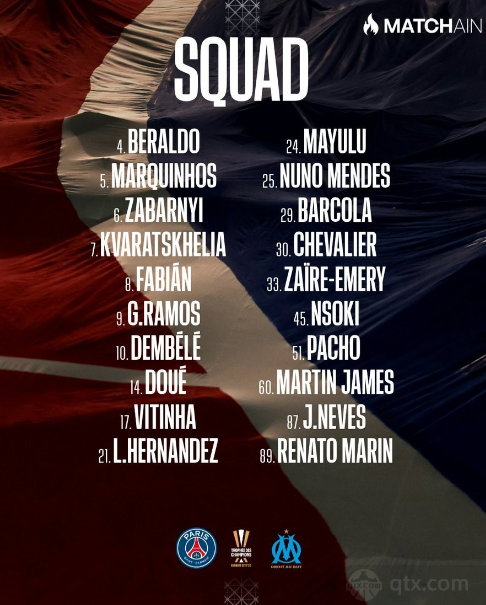 在巴黎圣日耳曼的名单中,大部分核心球员都有入选,包括进攻端以及防守端,因此球队能够以较为强大的阵容出击。在门将位置上,球队今年夏季转会窗引进的新援以及主力门将舍瓦利耶在列,这名门将在此前重新回到球队首发,在上一轮比赛中表现不错,预计将成为球队在法超杯比赛的首发门将。不过在门将位置上球队缺少了扑点能手萨福诺夫,这名门将在洲际杯决赛的比赛中帮助球队扑出多粒点球,不过也遭遇伤病,将会继续缺阵。