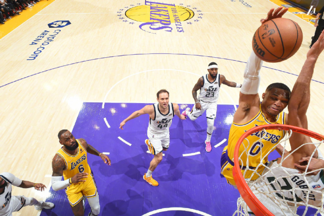 nba直播1月18日讯,NBA战火再燃,洛杉矶湖人队坐镇主场迎战犹他爵士队。比赛行进至第二节末段,威少突然暴起,滑翔隔扣戈贝尔,并搏得犯规,打成2+1。慢镜头显示,威少这球罚球线内一步就起跳,滑翔距离足够远,面对3届最佳防守球员,法国高塔戈贝尔毫不畏惧,勇往直前完成隔扣,让人惊呼!瞬间让人回到雷霆时期各种残暴飞扣的“威震天”,这球堪称经典,可视为威少湖人生涯的代表作了,提前预定年度十佳进球。