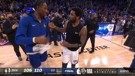 nba直播1月30日讯,在今天结束的一场NBA常规赛中,篮网在客场以106-110惜败勇士,遭到对手双杀。赛后,勇士新秀球员乔纳森-库明加和篮网球员凯里-欧文相互拥抱致意,欧文还将自己本场比赛身穿的球衣赠送给了库明加。