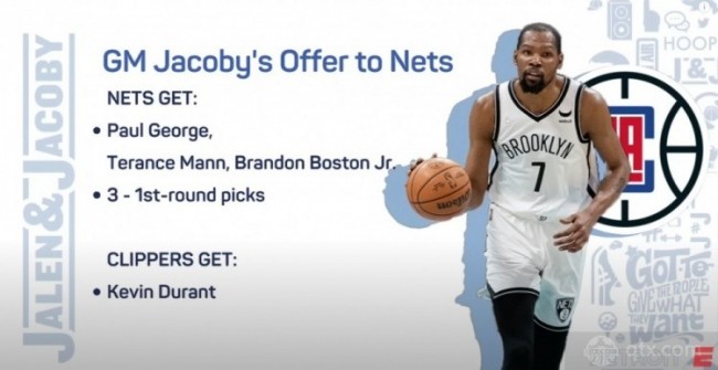 nba直播7月30日讯,目前关于杜兰特的交易案可以说是闹得沸沸扬扬,在后者明确向篮网提交离队申请后,前前后后已经有多支NBA球队询价,但都没能够获得篮网的认可,使得现在杜兰特的交易案限制停滞状态。稍早前,前NBA球员,现NBA评论员杰伦罗斯在一档节目中就提出了快船应该试着去交易杜兰特,他提出了快船打包乔治、曼恩、布兰登波士顿、3个首轮签去交换杜兰特,他认为如果KD和伦纳德一同打球,快船的首轮签不会值钱,另外他还希望把主帅泰伦卢给纳入交易案中。