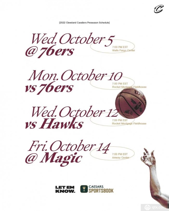 nba直播8月11日讯 北京时间8月11日克利夫兰骑士队官方发布了2022-2023赛季NBA季前赛的赛程。