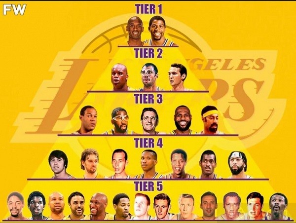 金字塔第二层有奥尼尔、贾巴尔和杰里-韦斯特。奥尼尔认为自己在湖人生涯只拿到了3座冠军奖杯是自己排在科比之后的原因,而作为NBA历史得分王的贾巴尔的巅峰并不完全是在湖人度过。而杰里韦斯特则因为冠军数的问题而掉档。