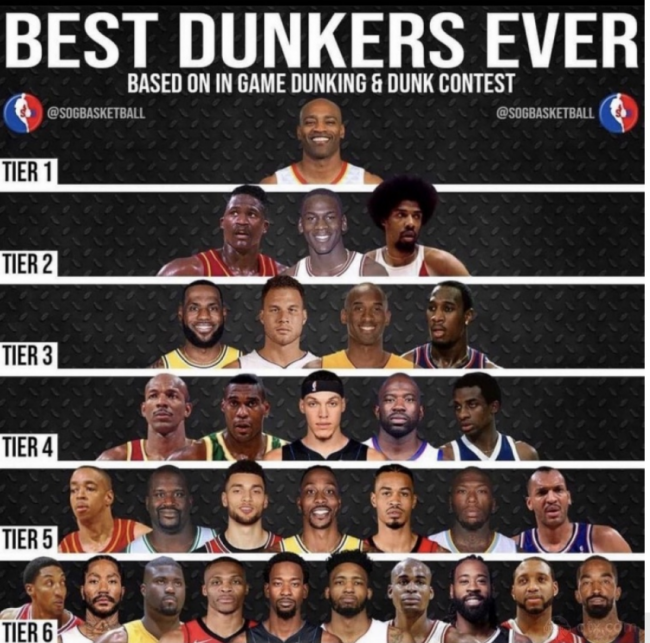 nba直播1月1日讯 在NBA的球场上,球员扣篮的瞬间总是让人看的热血沸腾。在今天NBA传奇球星大鲨鱼奥尼尔就晒出了一张历史扣将金字塔图(主要是结合球员的实战和扣篮大赛表现)。奥尼尔也配文写道:“该死。谁做的这个图?”