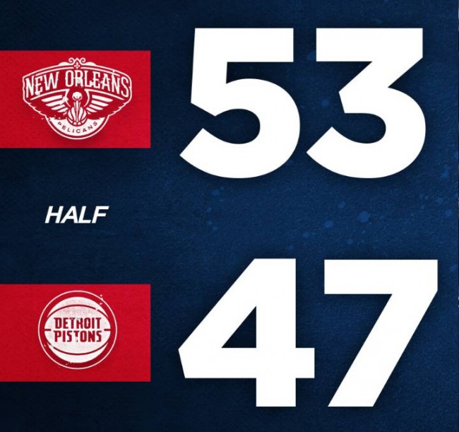 第二节,米凯柳克率先命中三分,鹈鹕内外开花再次将比分拉开。德拉蒙德和奥卡福两人因为早早领到3次犯规被替换下场,活塞连续获得罚球机会。活塞一度将分差缩小到1分。活塞连续通过外线追分,鹈鹕则强攻篮下。半场结束,鹈鹕53-47活塞。