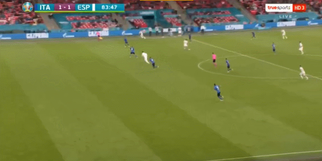 第80分钟,西班牙扳平比分!奥尔默直塞,莫拉塔禁区内得球冷静推射破门!意大利1-1西班牙!