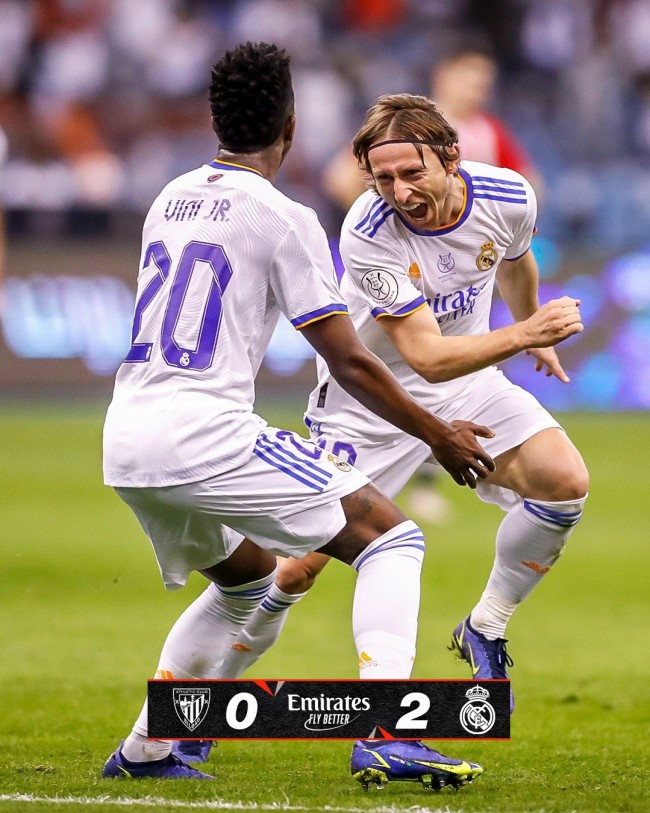 北京时间1月17日凌晨2:30,西班牙超级杯决赛在沙特展开,皇马对阵上赛季的卫冕冠军毕尔巴鄂竞技。上半场,罗德里戈助攻莫德里奇破门;下半场,本泽马造点并亲自命中再下一城,米利唐送点染红,库尔图瓦扑点。最终,皇马2-0轻取毕尔巴鄂竞技,夺得本赛季的西班牙超级杯冠军。