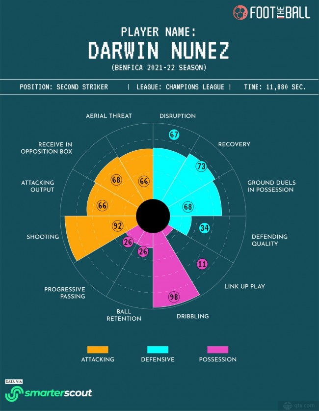 Smarterscout对0-99岁球员的各种技能进行了评分,尽管努涅斯控球时的评分比较低,但他的进攻能力评分却相当高。