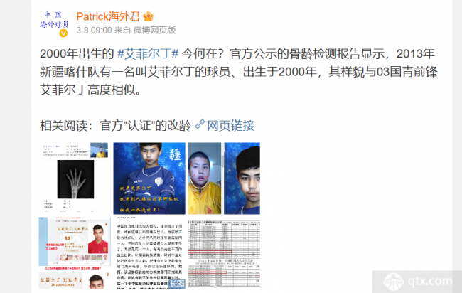 知名博主Patrick海外君是一名长期跟踪海外效力的中国球员的博主,他在微博中爆料,艾菲尔丁疑似更改年龄,将出生年龄从2000年改到了2003年,该博主表示:”2000年出生的艾菲尔丁今何在?官方公示的骨龄检测报告显示,2013年新疆喀什队有一名叫艾菲尔丁的球员、出生于2000年,其样貌与03国青前锋艾菲尔丁高度相似。”