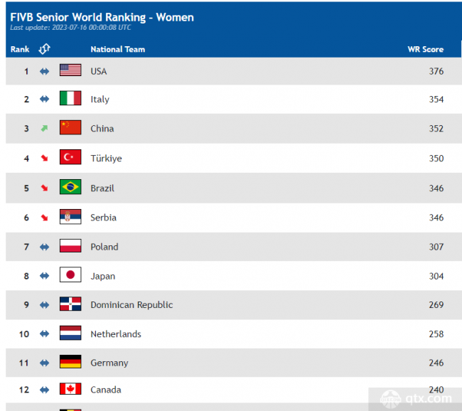 nba直播7月16日讯,根据最新的国际排联最新世界排名,中国女排在3-0战胜波兰女排,挺进决赛后,上升至世界第3。意大利女排和美国女排分别排名第二和第一。