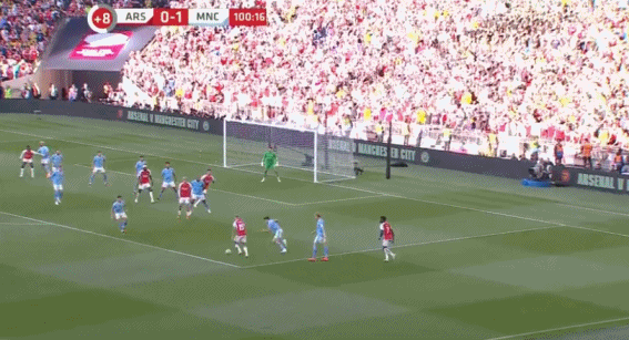 第100分钟,阿森纳右路角球配合,特罗萨德假动作射门,皮球打在阿坎吉身上折射入网。阿森纳1-1曼城!
