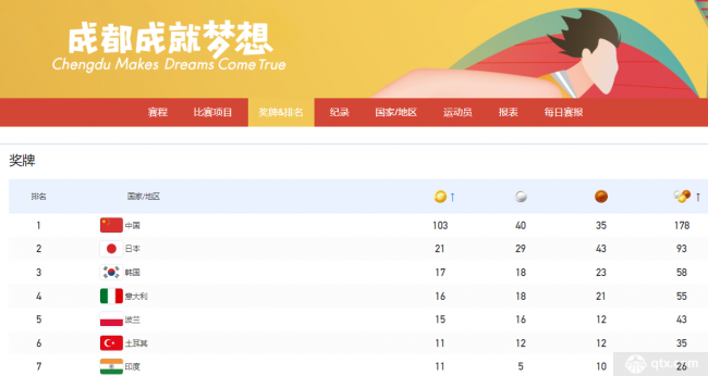 成都大运会金牌榜最新排名 中国队金牌奖牌数均第一