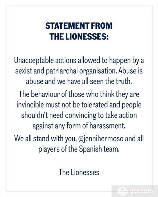 值得一提的是,英格兰女足就是在世界杯决赛中输给西班牙女足无缘冠军,但这则发声明则显示了女足球员们超越足球的力量。