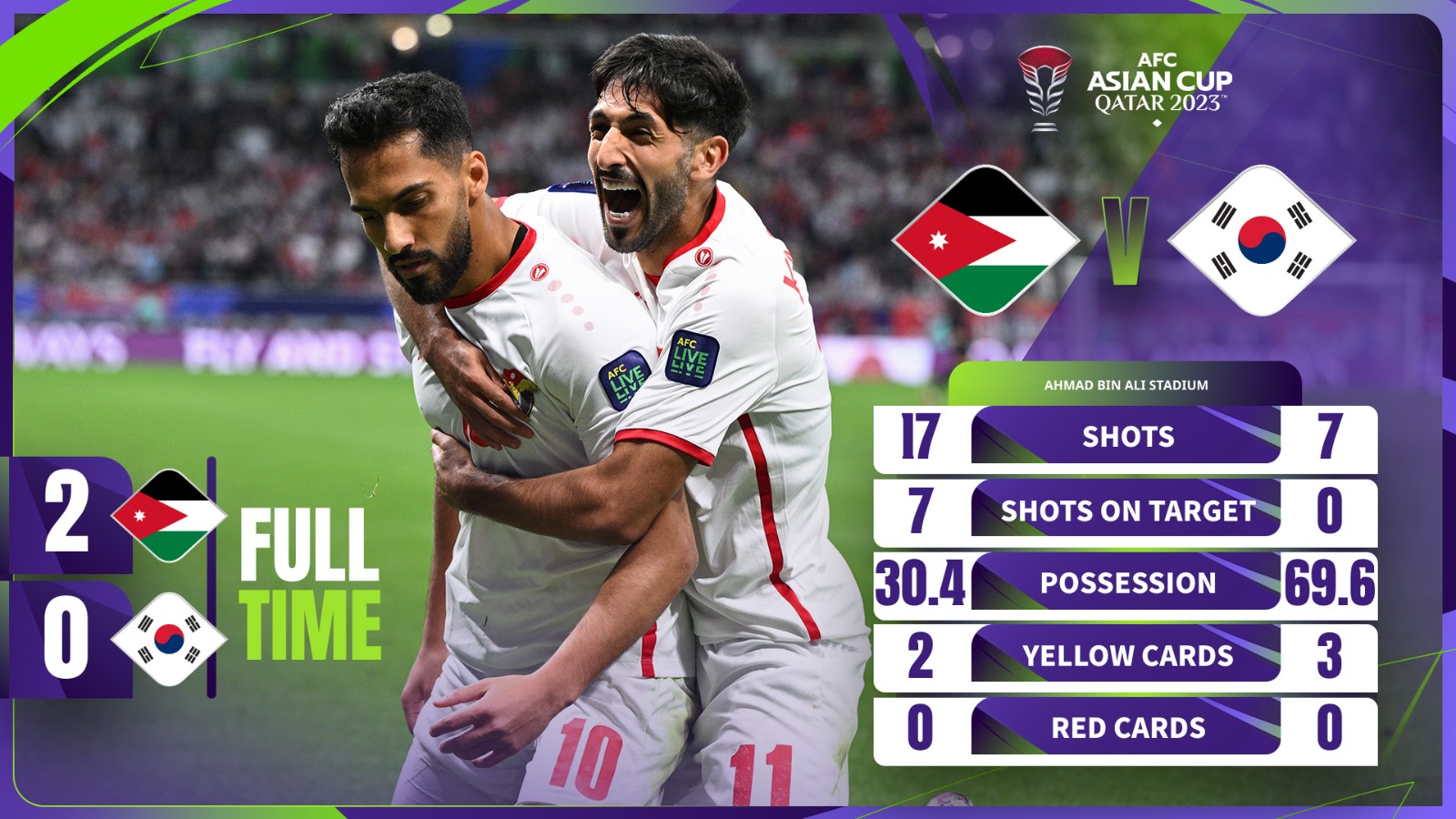 全场比赛结束,约旦2-0韩国。