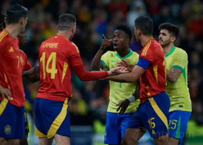 nba直播3月28日讯 西班牙在与巴西队的友谊赛中以3-3战平,西班牙被帕奎塔在伤停补时阶段扳平比分,错失了一场胜利。在比赛中双方在进去里面争夺角球的时候,维尼修斯和西班牙后卫拉波尔特产生了一些冲突。维尼修斯跑到拉波尔特身边,用肘部撞到拉波尔特的背上,尽管目前尚不清楚是什么促使他这样做。拉波尔特转过身来,愤怒地推开了他的手,维尼修斯指着他的脸,然后两边的队友们介入将他们分开。