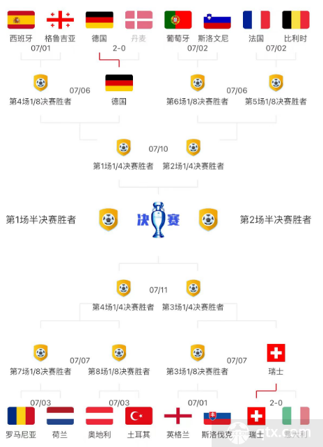 nba直播6月30日讯 2024欧洲杯已经进入到涛涛说阶段,在刚刚结束的两场比赛中,瑞士2-0击败了意大利,连续两届欧洲杯晋级八强,德国队同样以2-0的比分将丹麦淘汰,淘汰赛八强的席位已经诞生2席。值得一提的是瑞士队两届击败的球队都是前一届的决赛球队,他们在2021年欧洲杯淘汰的是2016年的亚军法国队。在雅金的带领下,这支瑞士在面临强敌的时候显得很冷静,包括在对阵德国的比赛中也达到了他们想要的目的。以下是本届欧洲杯淘汰赛的完成晋级图。