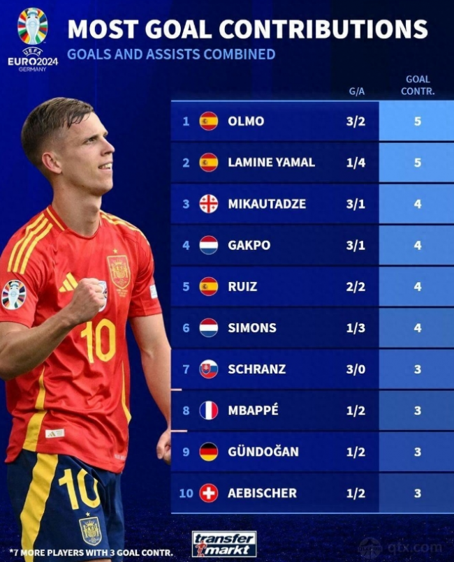 nba直播7月16日讯 2024年德国欧洲杯目前已经结束决赛的较量落下帷幕,最终西班牙在决赛2:1战胜英格兰获得了本届欧洲杯的冠军。而足球数据网站德国足球转会网也是在近日公布了本届欧洲杯球员参与进球数的榜单。在这份榜单中,西班牙的前锋奥尔默以及亚马尔并列榜首,另外格鲁吉亚前锋米卡塔泽、荷兰前锋加克波以及西班牙中场法比安-鲁伊斯等球员位列其后。