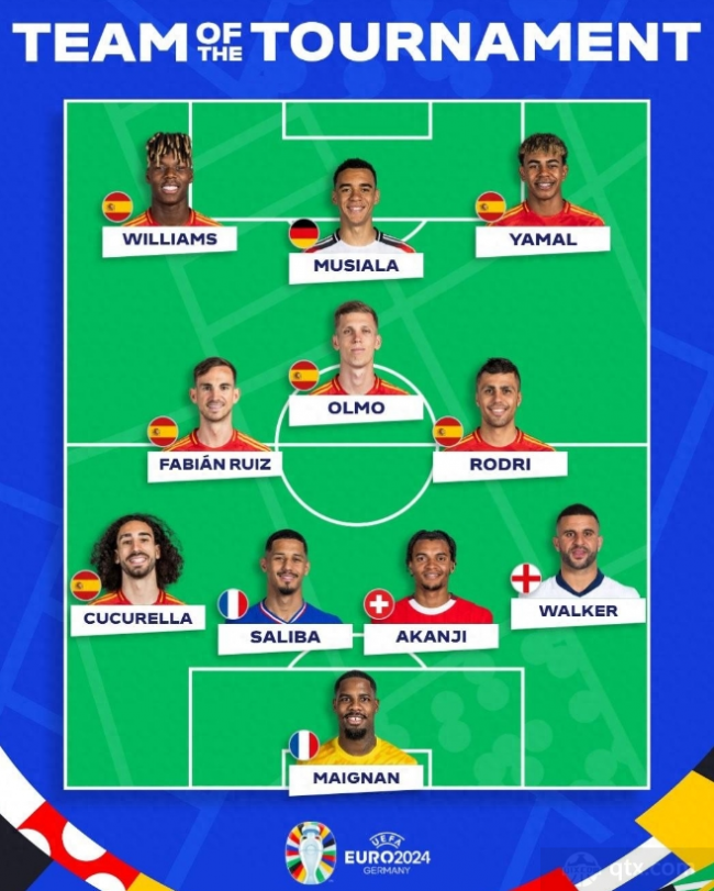 nba直播7月17日讯 近日,2024年德国欧洲杯已经正式落下帷幕,西班牙最终获得了欧洲杯的冠军。在北京时间昨日晚间,欧足联公布了本届欧洲杯的最佳球员阵容。在这份阵容中,西班牙的入选人数最多,有6名球员入选。法国有2名球员入选,英格兰、德国以及瑞士各有1名球员入选。其中,西班牙前锋亚马尔、中场罗德里以及法国后卫萨利巴也是吸引关注的球员。