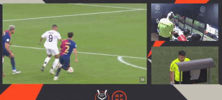 第35分钟,卡马文加踢倒了加维,裁判观看VAR之后判给了巴萨点球。