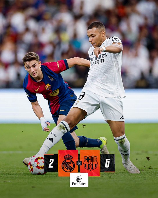 1月13日3:00,西班牙超级杯迎来最终的决赛,皇家马德里对阵巴塞罗那。上半场,姆巴佩先下一城,亚马尔扳平比分,莱万点射,拉菲尼亚头槌,巴尔德伤停补时阶段锁定胜局;下半场,拉菲尼亚双响,姆巴佩造红牌,罗德里戈任意球破门。最终,十人巴萨5-2击败皇马,夺得西班牙超级杯冠军。