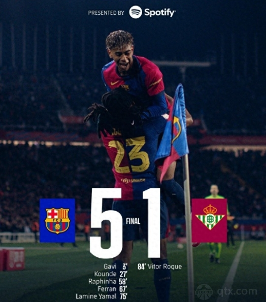国王杯巴塞罗那5-1皇家贝蒂斯 球队五名球员建功