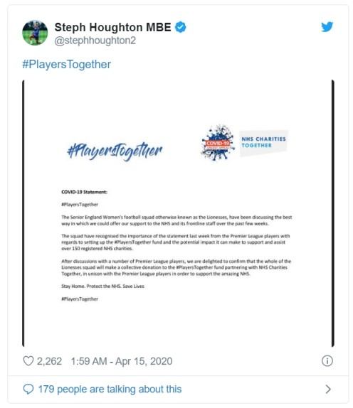 晚上7点,英格兰女足在社交媒体上发布了一份联合声明,证实了这一消息。声明中说:“上周,英超球员们发表了一份声明,他们意识到了这份声明的重要性,并表示将设立‘球员共同基金’,以支持和帮助150多家注册的NHS慈善机构。在与多名英超球员讨论后,我们很高兴地确认,球队全体成员将向球员基金捐款。”