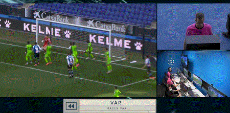 第16分钟,恩巴尔巴右路角球传入禁区,德托马斯后点头球攻门,恩特卡门线上用手将球挡出。裁判观看VAR之后,判罚恩特卡故意手球,向其出示红牌罚下,吹罚点球。德托马斯点球命中,西班牙人1-0富恩拉夫拉达!