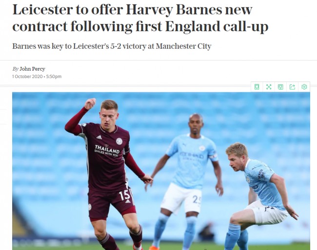 莱斯特准备为现年22岁的边锋哈维-巴恩斯提供一份新合同,巴恩斯入选了最新一期的英格兰国家队大名单。(电讯报)