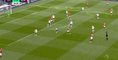 第39分钟,恩东贝莱传球,哈里-凯恩斜塞,小卢卡斯禁区右侧横敲,孙兴慜后点推射破门,热刺1-0曼联!