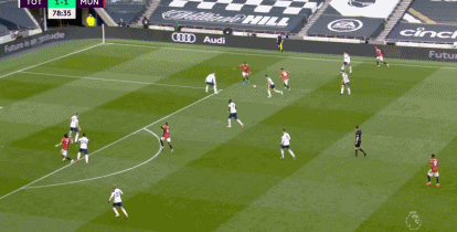 第79分钟,B-费尔南德斯分球,格林伍德禁区右侧传中,卡瓦尼禁区内头槌破门,热刺1-2曼联!