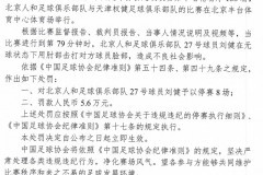 中国足协官方通报北京人和球员刘健停赛8场,罚款5.6万元。刘健在第中超第17轮比赛进行到第79分钟时,在无球状态下肘击对方球员吴伟的脸部,并被红牌罚下。