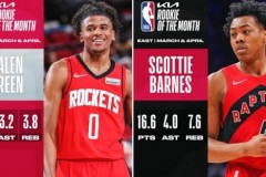 nba直播4月12日讯,今日NBA官方发布了3月-4月最后一期最佳新秀,猛龙队斯科蒂-巴恩斯和火箭队杰伦-格林当选。