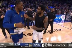 在今天结束的一场NBA常规赛中,篮网在客场以106-110惜败勇士,遭到对手双杀。赛后,勇士新秀球员乔纳森-库明加和篮网球员凯里-欧文相互拥抱致意,欧文还将自己本场比赛身穿的球衣赠送给了库明加。