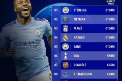 转会市场近期更新了足坛左边锋的身价排名,斯特林和内马尔以1.6亿欧元的身价并列榜单第一。