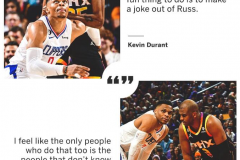 北京时间2023年4月23日凌晨3点30分,在2022-2023赛季NBA季后赛结束的一场比赛中,快船在主场以100-112不敌太阳。本场比赛,快船球员拉塞尔-维斯布鲁克延续了此前优异的状态,他全场出战40分钟,29投17中,三分球6投3中,得到37分6篮板4助攻1抢断1盖帽。赛后,太阳球员凯文-杜兰特和克里斯-保罗在接受媒体采访时,纷纷称赞了威少本场比赛的表现。保罗表示批评威少的那些人完全就不懂篮球,杜兰特在一旁对保罗的发言表示了同意。