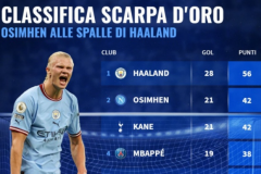 欧洲金靴最新排名:哈兰德56分最多第1 奥斯梅恩凯恩并列第2