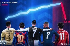 由于新冠肺炎疫情形势依旧严峻,德转就这特殊时期全球球员的身价进行了一次调整。根据数据统计,调整后的全球球员总身价蒸发了92亿欧元。